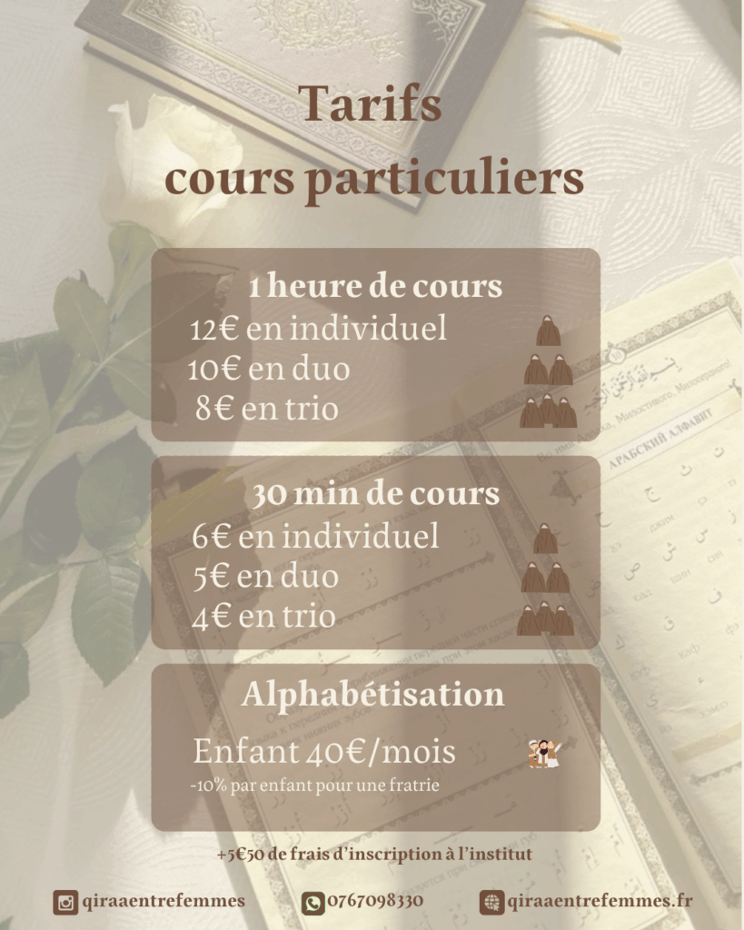 Les cours d’apprentissages d’invocations sont mis en place pour les soeurs souhaitant se rapprocher de leur Créateur tout au long de la journée. Nous enseignons la compréhension et la mémorisation de plusieurs invocations du quotidien.